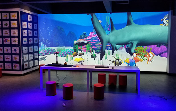 互動涂鴉軟件主要由一體機互動桌、海洋主題軟件、多點觸控系統、投影墻等設備組成制作而成,是一款兒童互動多媒體繪畫設備娛樂。墻面投射出海洋主題的展示畫面。當孩子們點擊小屏幕并涂鴉所選作品后,通過觸摸屏把它甩到投影墻上。